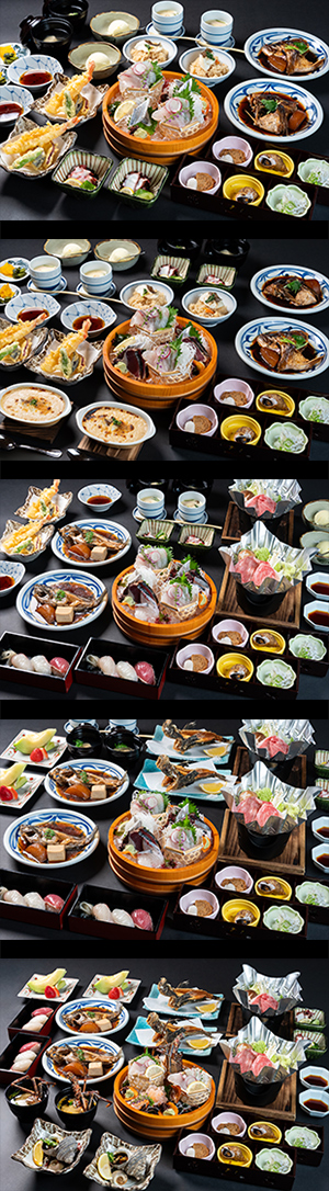 [先付 小鉢三種、本日のお造里、鯛煮付け、鯛グラタン、天婦羅盛り合わせ、鯛茶碗蒸し、旬の酢の物 口直し、鯛清汁、鯛釜飯、香の物、デザート]